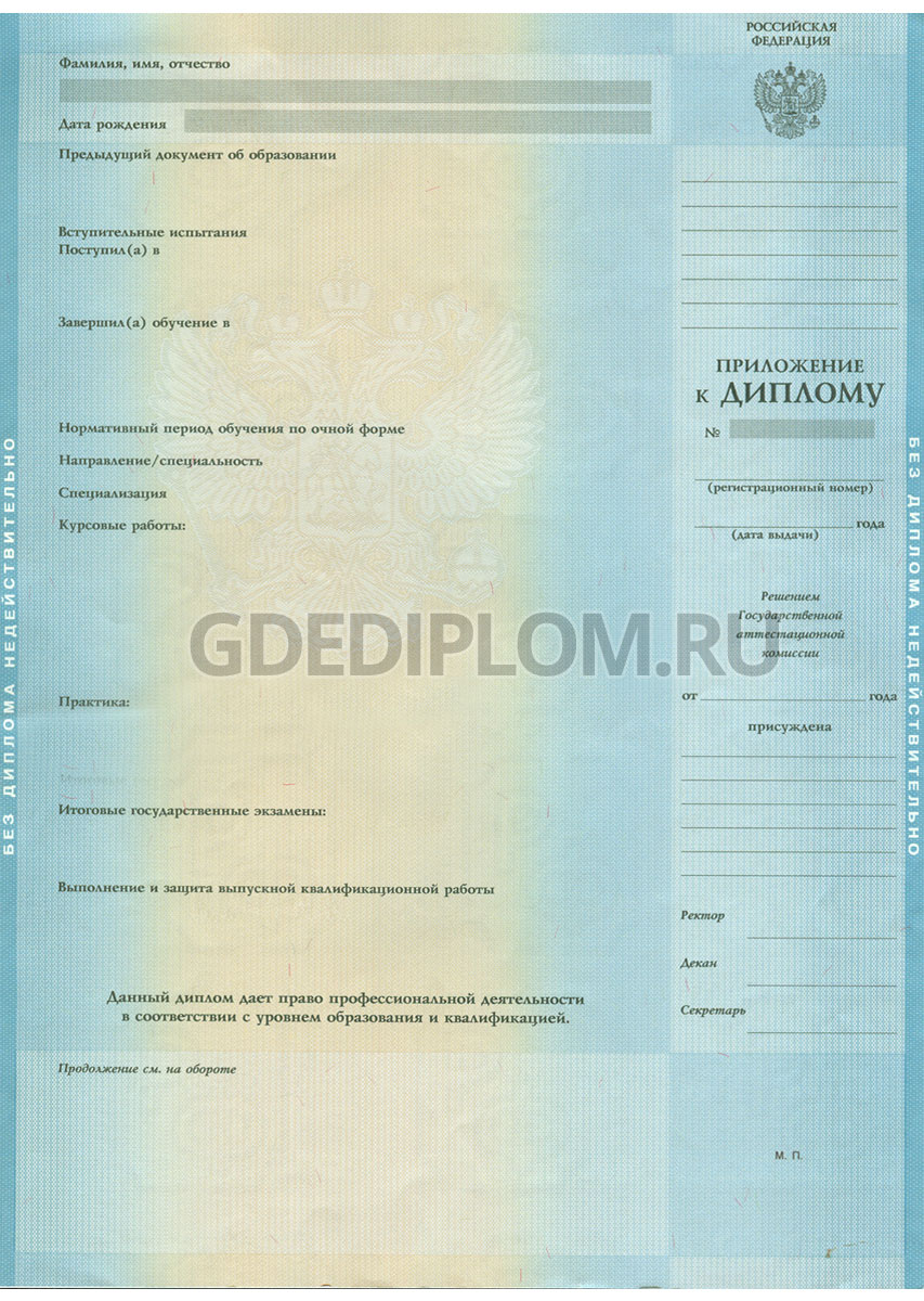 Государственное приложение к диплому 2014, 2015, 2016, 2017, 2018, 2019 года. Диплом изготавливается на оригинальном бланке гособразца (Гознак), заполняется по стандартам Минобрнауки и выбранного ВУЗа.